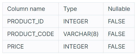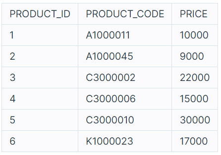 PRODUCT_ID, PRODUCT_CODE, PRICE는 각각 상품 ID, 상품코드, 판매가를 나타냅니다.